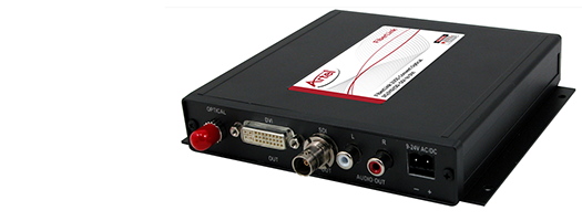 The Fiberlink 3355 Series receives SMPTE standard 3G, HD or SD-SDI signals transmitted from the Fiberlink 3350 or Fiberlink 3380 Series transmitters, with or without embedded audio, and converts the baseband output to DVI.