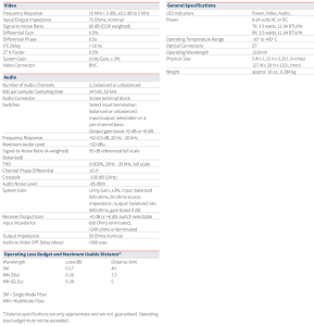 Two audio channels that may be user-configured for balanced or unbalanced inputs and outputs. Switch selectable audio output gain boost of +0 dB or +6 dB. Indicator LEDs monitor power, video and audio signals. Transmits over one multimode or single mode fiber. No adjustments; pure digital processing and transmission.