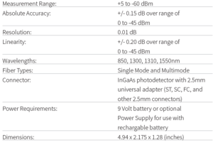 It has an attractive handheld case with an easy-to-read graphical liquid crystal display and a 2-key keypad for easy operation. It is offered with a 2.5mm universal fiber connector for easy connection to ST, SC, and FC connectors, will operate for over 250 hours on a standard high-capacity 9v battery, and has built-in auto shutdown. The built-in charger port allows for wall power operation, as well as for charging 9-volt re-chargeable batteries.
